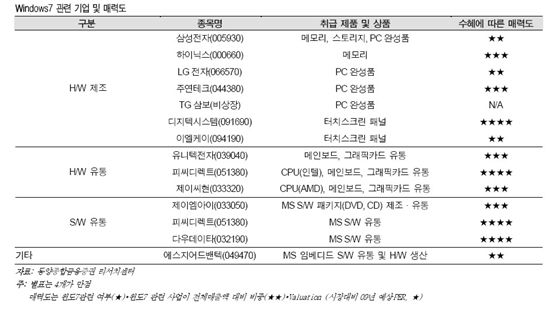 이상윤 애널리스트는 '윈도7' 출시와 관련된 기업을 크게 하드웨어 제조ㆍ유통, 소프트웨어 유통 관련 기업으로 구분했다. 그는 "하드웨어 제조분야의 업체들은 윈도7의 성공을 전제로 향후 이루어질 신규 및 교체 PC 수요에 따른 실적개선의 가능성이 높다는 점에서 수혜가 예상된다"며 "특히 터치 인터페이스를 채택한 넷북의 매출 성장이 높게 나타날 것으로 전망되는 만큼 터치패널 업체들에게는 윈도7 출시가 외형 성장의 기회로 작용될 전망"이라고 말했다. 전체 매출액 대비 넷북의 매출 비율이 높은 TG삼보(셀런의 자회사), 터치패널을 납품하는 디지텍시스템, 이엘케이가 수혜종목으로 꼽혔다.