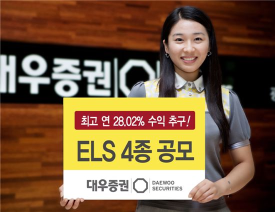 대우증권은 28일부터 최고 연 28.02% 수익을 추구하는 주가연계증권(ELS) 4종을 공모한다고 이날 밝혔다. 이번 공모는 각각 KOSPI200, 우리금융, CJ, 신한지주, POSCO, 한국전력, KT&G 등을 기초자산으로 하며 총 400억원 규모다.