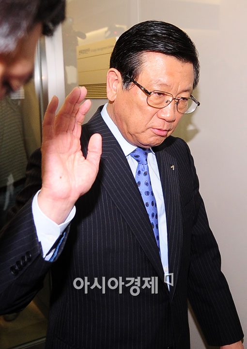 박삼구 금호아시아나 그룹 회장이 28일 오후 서울 신문로 금호아시아나 본사에서 '총수 일가 동반 퇴진' 긴급 기자회견 마친후 손을 흔들며 회견장을 나서고 있다.