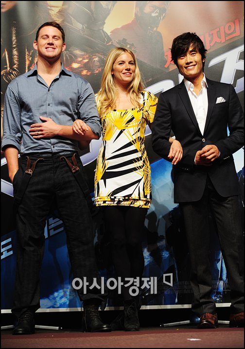 [아시아경제신문 박성기 기자]29일 오전 11시 서울 장충동 신라호텔에서 열린 영화 'G.I.Joe (지 아이 조:전쟁의 서막)' 기자간담회에서 배우 채닝 테이텀과 시에나 밀러, 이병헌이 포즈를 취하고 있다.