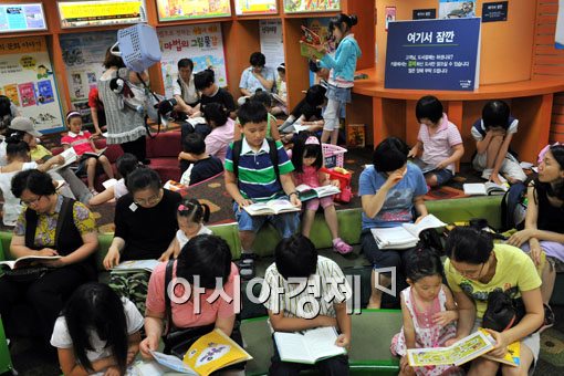 본격적인 휴가철을 맞은 29일 오후 서울 광화문의 한 대형서점을 찾은 아이들이 부모님과 함께 복잡한 피서지 대신 시원한 서점에서 도서삼매경에 빠져 있다.