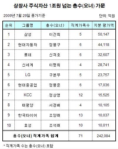 이 밖에도 정몽준 한나라당 국회의원 직계가족(1조7036억원), 정상영 KCC 명예회장의 직계가족(1조5525억원), 서경배 아모레퍼시픽 대표이사의 직계가족(1조105억원), 조양래 한국타이어 회장의 직계가족(1조37억원), 조석래 효성그룹 회장의 직계가족(1조11억원)등이 그 뒤를 이어 10위권에 들었다.