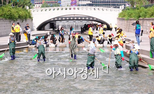적십자 봉사단원들과 서울시 관계자들이 30일 오전 서울 청계천일대 환경정화 활동을 벌이고 있다.