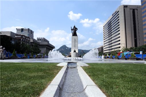 광화문광장의 상징아이콘 '분수 12ㆍ23'이 이순신장군 동상을 감싸고 있다. 동상 앞 잔디밭과 물길, 뒷편의 파란하늘과 북악산을 향해 확 트인 조망이 일품이다. 광화문광장은 8월1일 문을 연다. 사진제공/서울시