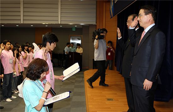 $pos="C";$title="";$txt="이백순 신한은행장(맨 오른쪽)이 31일 서울 태평로 본점에서 '2009년 Tops Love 청소년 환경자원봉사캠프' 출발에 앞서 청소년자원봉사단 대표들로부터 선서를 받고 있다.