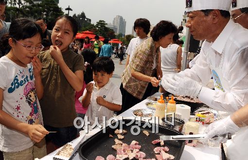 농협과 양돈자조금관리위원회가 31일 서울 용산역 광장에서 여름 휴가철을 맞아 '국산 돼지고기 저지방부위 소비촉진 시식행사'를 개최 했다. 이날 행사를 찾은 시민들이 다양한 돼지고기 요리를 시식 하고 있다.