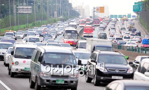 경부고속도로 양재IC 부근이 늘어난 차량으로 극심한 정체를 빚고 있다.