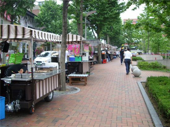 먼저 기존에 영업하고 있는 노점상 중에서 먹거리 34개, 액세서리 3개, 의류ㆍ잡화 19개, 기타 1개 등 총 57개 노점을 대상으로 판매대를 규격화하고 시간을 정해 운영하기로 했다.