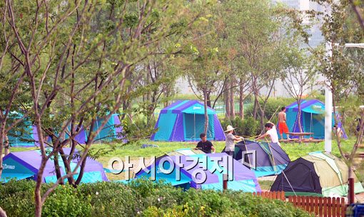 한강시민공원중 유일하게 야영과 취사를 할수 있는 난지캠핑장 개장을 앞둔 3일 오후 관계자들이 캠핑장비등을 점검하고 있다.