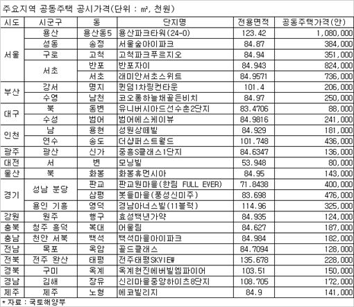 이밖에도 △대구 9119가구 △광주 8893가구 △충남 8369가구 △경남 7502가구 △경북 7275가구 △인천 6023가구 △부산 4776가구 △강원 3491가구 △전북 3078가구 △충북 2300가구 △전남 1029가구 △제주 661가구 △대전 281가구 등의 공시가격이 공개됐다.
