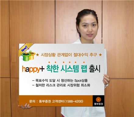 동부증권(대표이사 사장 김호중)은 시스템 트레이딩 전문 서비스 업체인 착한랩과 제휴해 시장 상황에 관계없이 절대수익을 추구하는 '동부 happy+ 착한 시스템 랩(Wrap)'을 출시했다.