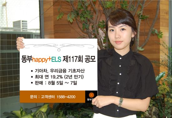 기아차과 우리금융를 기초자산으로 하는 ‘동부 happy+ ELS 제117회’는 2년 만기 상품으로 4개월 주기의 조기상환평가일에 평가가격이 최초기준가격의 85%(4개월, 8개월), 80%(12개월, 16개월), 75%(20개월, 24개월) 이상이면 연 19.2% 수익이 지급된다. 다만, 투자기간 중 기초자산이 한종목이라도 최초기준가격의 45% 미만으로 하락한 적이 있는 경우 만기상환조건에 따라 손실을 볼 수 있다.