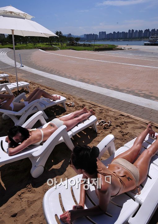 서울 낮 최고기온이 30도를 오르내리는 무더운 날씨가 계속되고 있는 5일 오전 서울 광진구 자양동 뚝섬한강공원 선탠장을 찾은 늘씬한 미녀들이 선탠을 즐기고 있다.