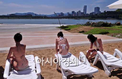 서울 낮 최고기온이 30도를 오르내리는 무더운 날씨가 계속되고 있는 5일 오전 서울 광진구 자양동 뚝섬한강공원 선탠장을 찾은 늘씬한 미녀들이 선탠을 즐기고 있다.