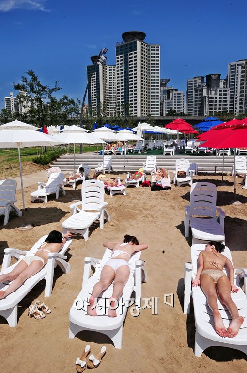 서울 낮 최고기온이 30도를 오르내리는 무더운 날씨가 계속되고 있는 5일 오전 서울 광진구 자양동 뚝섬한강공원 선탠장을 찾은 늘씬한 미녀들이 선탠을 즐기고 있다.