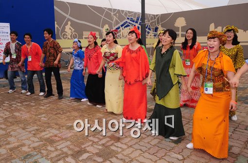 7일 오전 인천 연수구 송도국제도시에서 개막된 '인천세계도시축전'에서 축제 자원 봉사자들이 세계도시관앞에서 아프리카 전통춤 공연을 하고 있다.