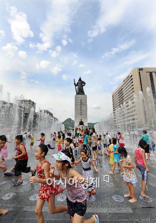 태풍 모라꼿이 우리나라에 큰 영향을 주지 못하고 있는 가운데 7일 오후 서울 종로구 세종로 광화문광장 분수대에서 어린이들이 푸른 하늘아래 분수 물줄기를 맞으며 신나게 뛰어놀고 있다.