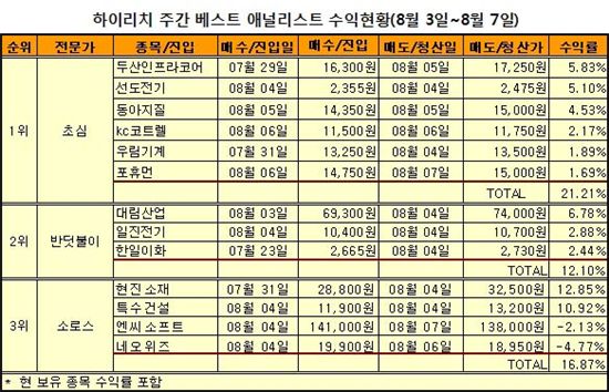 '초심'과 '반딧불이'가 8월 첫 주 하이리치 주간 베스트 애널리스트 1, 2위에 각각 선정됐다.