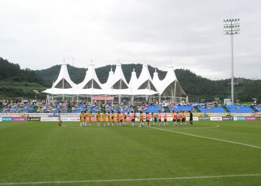 $pos="C";$title="";$txt="▲ 11일 첫 공식경기를 가진 목포 국제축구센터 전경. 뒷 편 갓바위를 형상화한 하프돔이 목포의 명소로 부각되고 있다.