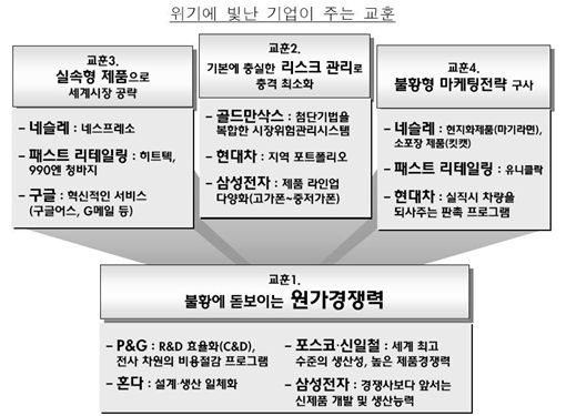 12일 삼성경제연구소는 '최근 위기에 빛난 기업의 교훈' 보고서를 내고 "위기 시 상대적으로 우수한 성과를 보인 글로벌기업은 강력한 원가경쟁력과 철저한 리스크 관리능력, 고품질·저가격 제품군, 효율적 마케팅 능력 등을 보유했다"고 설명했다.