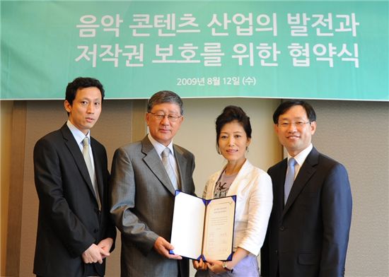 $pos="C";$title="";$txt="한국음악저작권협회,한국음악실연자연합회,NHH이 12일 ‘음악 콘텐츠 산업의 발전과 저작권 보호 등을 위한 공동협약’을 맺고, 음악 콘텐츠 산업의 발전, 저작권 보호, 이용자의 공정한 이용을 보장을 위해 서로 협력키로 했다. (왼쪽부터) 김영산 문화체육관광부 저작권정책관, (사)한국음악저작권협회 지명길 회장, (사)한국음악실연자연합회 정훈희 부회장, NHN 김상헌 대표가 협약서를 들어 보이고 있다.