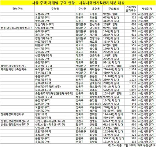 부동산정보업체 부동산114에 따르면 지난달 3주차 기준 서울 주택 재개발 구역 중 사업시행인가와 관리처분 단계를 진행중인 곳은 총 38구역인것으로 나타났다. 이 중 사업시행인가인 곳은 총 37곳, 관리처분은 1곳으로 조사됐다. 재개발 사업 진행단계는 사업시행인가 다음이 관리처분이며 이후 이주, 철거, 착공/준공 등의 순으로 진행된다.