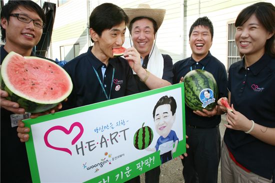 홍준기 웅진코웨이 사장은 13일 자사 공장이 위치한 충남 공주시 신풍면 농가에서 직거래로 구입한 수박 1700여통(약 1900만원 상당)을 본사 및 R&D연구센터, 공장, 지국 등에서 근무중인 모든 직원들에게 선물했다.