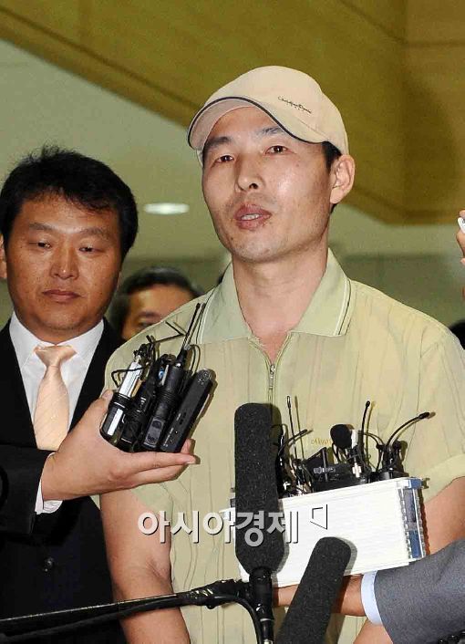 북한에 억류된 지 137일 만인 13일 오후 전격 석방된 현대아산 직원 유성진 씨가 경기도 파주 도라산 남북출입사무소(CIQ)를 통해 귀환하며 소감을 밝히고 있다.