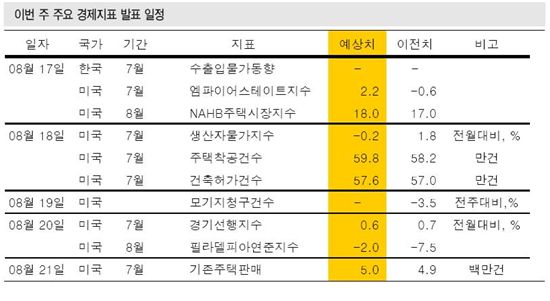 또한 전미주택건축업자연합의 8월 지수와 연준의 제조업활동 관련 서베이 자료가 17일, 미 노동부의 생산자물가지수는 18일, 7월 기존 주택과 신축 주택 판매와 관련된 보고서들도 주말께 발표된다.