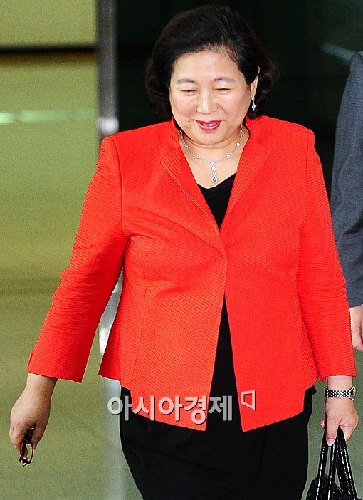 현정은 현대그룹 회장이 7박8일간의 방북 일정을 마치고 17일 오후 경기 파주 도라산 남측출입사무소를 통해 입경하는 도중 마중나온 현대그룹 관계자들이 박수를 치자 가볍고 목례를 하고 있다.
