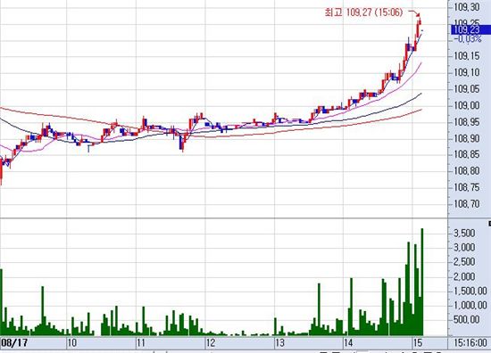 하지만 코스피지수가 1550선이 깨지기 시작한 오후 2시30분 무렵부터 국채선물이 급등세를 연출했다. 장중 고점은 장막판 기록한 109.27.