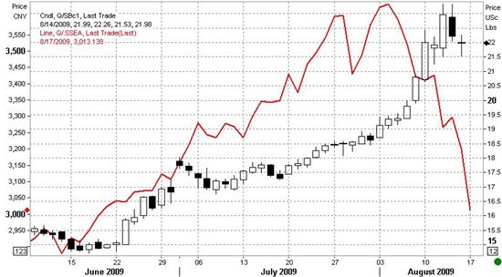 8월3일을 기점으로 중국증시가 하락반전을 시작했고 미달러도 8월4일이후 반등에 성공했음에도 설탕값은 오히려 상승폭을 키운것으로 미루어 현재 설탕을 둘러싼 긍정적 펀더멘털을 감안한다하더라도 8월3일이후 반등분은 투기에 의한 급등일 가능성이 농후하다.