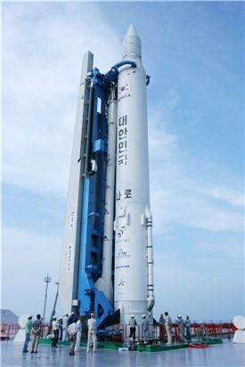 발사 D-2일을 앞둔 나로호가 발사대에 장착, 하늘을 향해 곧게 세워졌다.