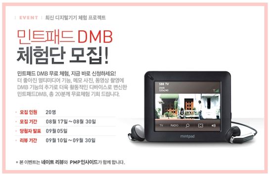 체험단으로 선정된 20명은 오는 9월 10일부터 30일까지 민트패드DMB를 무료로 사용하고 제품에 대한 자유로운 의견과 함께 꼼꼼한 체험기를 작성해 등록하면 된다.