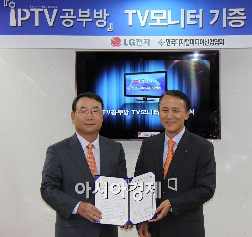 LG전자와 한국디지털미디어산업협회가 교육용 인터넷 콘텐트를 TV로 내려받아 공부하는 ‘IPTV 공부방’을 공동 후원한다. 19일 열린 협약식에서 김인규 한국디지털미디어산업협회 회장(왼쪽), 김영기 LG전자 부사장이 기념촬영을 하고 있다.