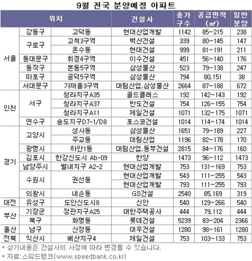 부동산정보업체 스피드뱅크에 따르면 9월 들어 전국 56개 단지에서 총 4만4165가구 중 2만5999가구(임대, 오피스텔 제외)가 일반 분양될 것으로 조사됐다.
