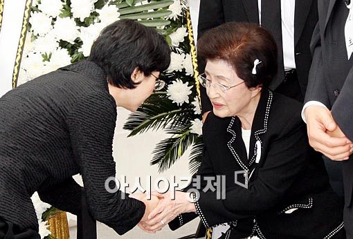 21일 오전 서울 국회에 마련된 김대중 전 대통령 빈소를 찾은 한 조문객이 이희호 여사를 위로 하고 있다.