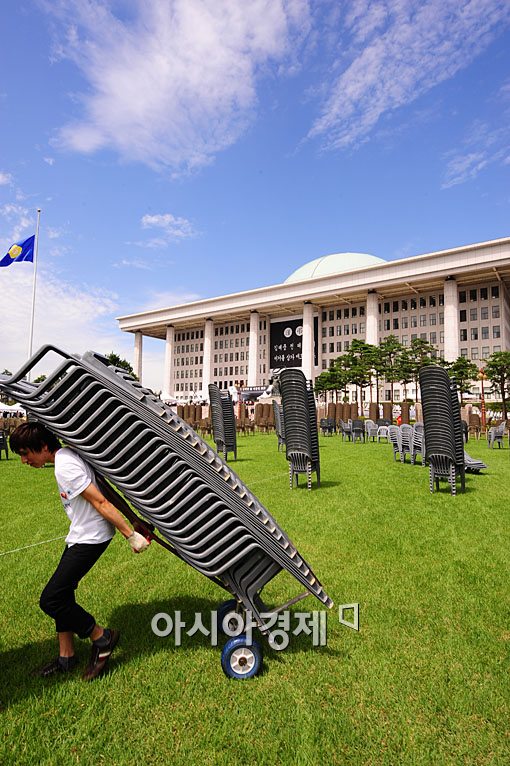 21일 국회 잔디밭에서 관계자들이 오는 23일 열릴 예정인 김대중 전 대통령 영결식 준비를 하고 있다.