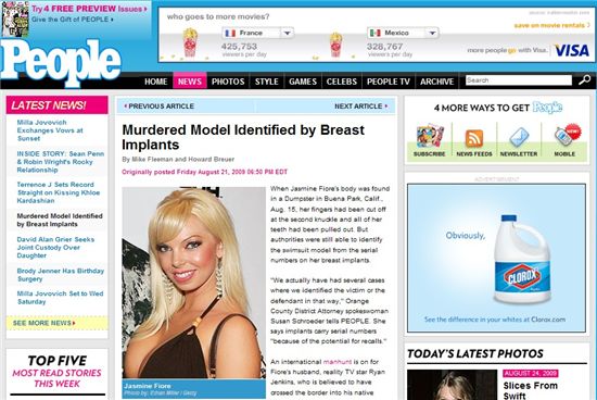 21일(이하 현지시간) 미국 연예전문지 피플 온라인판에 따르면 지난 15일 미국 캘리포니아 브에나파크에서 발견된 사체의 신원은 플레이보이 모델 출신의 자스민 피오레(28)인 것으로 드러났다.