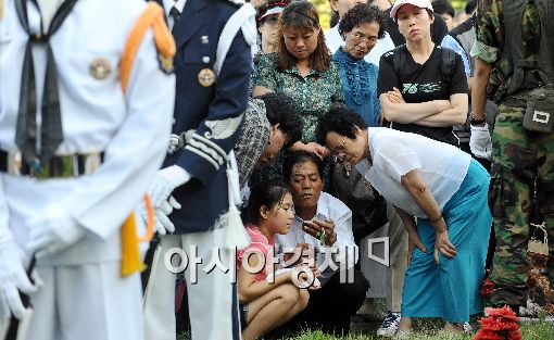 故 김대중 전 대통령 국장(國葬) 안장식이 23일 서울 동작동 국립현충원에서 열린 가운데 추모객들이 DMB를 시청하고 있다.