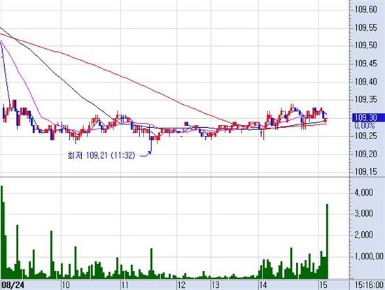 24일 채권선물시장에서 9월만기 국채선물은 지난주말보다 17틱 하락한 109.30으로 장을 마쳤다. 하지만 저평은 20틱 가량으로 크게 축소됐다. 이날 국채선물은 전장대비 14틱 하락한 109.33로 개장한 바 있다.