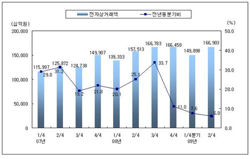 통계청이 25일 발표한 ‘2009년 2·4분기 전자상거래 및 사이버쇼핑 동향’에 따르면, 올해 2·4분기 전자상거래 총거래액은 166조9030억원으로 지난해 같은 기간에 비해 6.0% 증가했다.