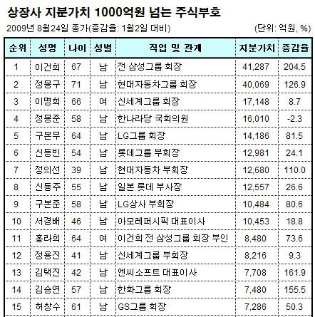 재벌닷컴은 코스피지수가 2000선을 넘었던 지난 2007년 10월 현대중공업 대주주인 정몽준 한나라당 국회의원이 4조2350억원을 기록한 적이 있었지만 상장사 주식지분 가치가 4조원을 넘는 주식거부가 2명이 탄생한 것은 이번이 처음이라고 밝혔다.