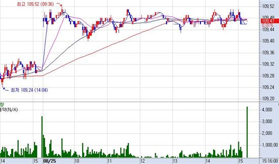 이날 국채선물은 18틱 오른 109.48로 개장한 바 있다. 장중 등락폭은 12틱에 불과했다. 그것도 장초반 기록한 최고가 109.52과 최저가 109.40간의 폭이다. 장중반부터 마감까지는 5틱 안팎인 109.45와 109.50에서 움직였다.