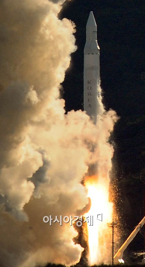 우리나라 첫 우주발사체 '나로호(KSLV-1)'가 25일 오후 5시 전남 고흥군 외나로도 나로우주센터에서 힘차게 날아오르고 있다.