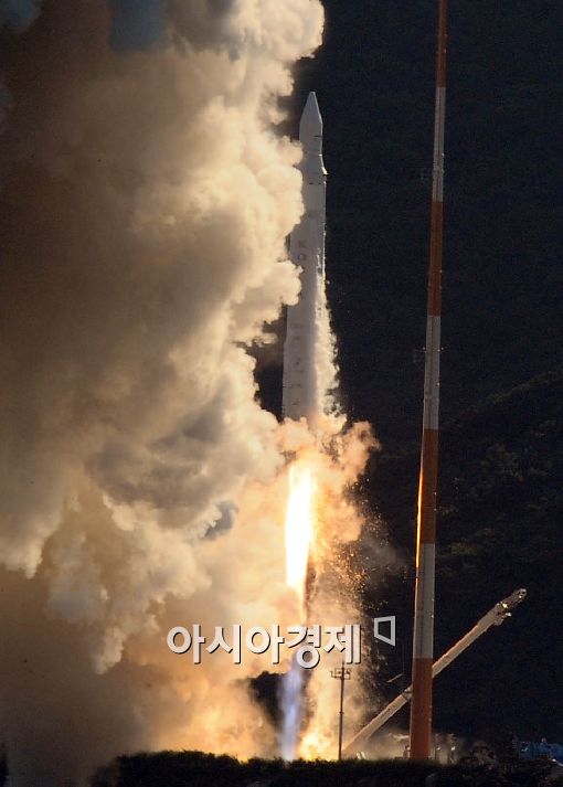 우리나라 첫 우주발사체 '나로호(KSLV-1)'가 25일 오후 5시 전남 고흥군 외나로도 나로우주센터에서 힘차게 날아오르고 있다.