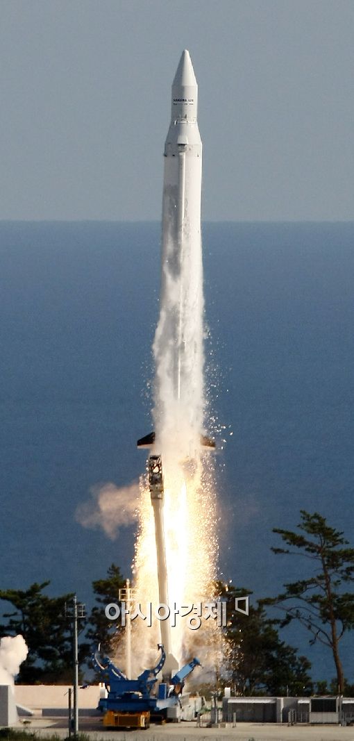 역사적인 한국 첫 우주발사체 나로호(KSLV-I)가 25일 오후 5시 전남 고흥군 외나로도 나로우주센터에서 발사돼 힘차게 우주로 날아가고 있다. 사진공동취재단