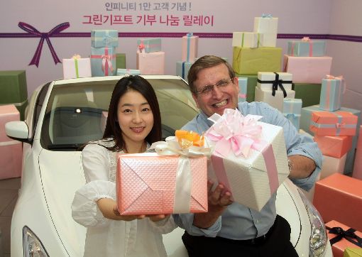 한편 국내외 기업 중 최초로 인피니티가 동참하는 ‘그린기프트’는 서울시가 공공기관 최초로 진행하는 기부 프로그램으로 승진, 영전, 가족 기념일에 선물이나 기념품 대신 주인공의 이름으로 기부하는 프로그램이다. 주인공은 축하카드와 함께 세액공제용 기부금 영수증을 축하선물로 받아 자연스럽게 기부문화에 동참하는 계기가 된다.