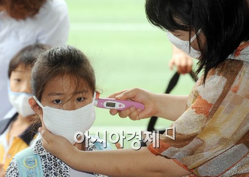 교과부가 신종플루 확산을 방지하기위해 모든 초.중.고교에서 등교하는 학생들에게 발열검사를 실시하는 고강도 대책을 발표한 가운데 27일 오전 서울 이촌동 신용산 초등학교에서 교사들이 등굣길 아이들의 체온을 검사하고 있다.