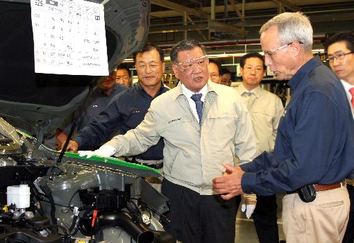 $pos="C";$title="정몽구";$txt="";$size="510,350,0";$no="200908280934133683018A_1.jpg";@include $libDir . "/image_check.php";?>정몽구 현대·기아차그룹 회장이 27일(현지시간) 현대차 앨라바마 공장(HMMA)의 싼타페 의장라인에서 현장 직원과 차량 상태를 점검하고 있다.